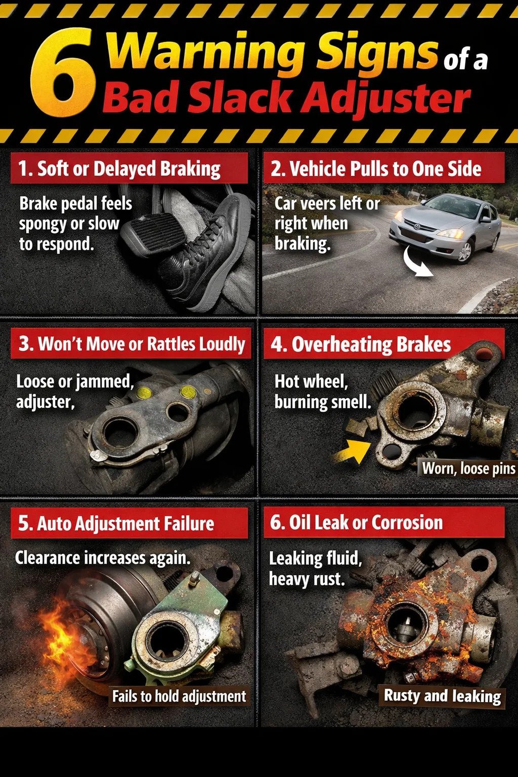 ويرجع ذلك عادةً إلى أن أداة ضبط الارتخاء لا تعوض بشكل فعال تآكل وسادة الفرامل، مما يؤدي إلى خلوص زائد. يجب أن يتحرك قضيب دفع غرفة الهواء لمسافة طويلة قبل تعشيق الفرامل.