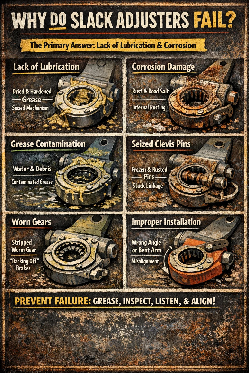 وفي الغالبية العظمى من الحالات، تفشل أدوات الضبط البطيئة بسبب نقص التشحيم الروتيني والتآكل البيئي. ونظرًا لوجود هذه المكونات على الجانب السفلي من الهيكل، فإنها تتعرض باستمرار لحطام الطريق والماء والمواد الكيميائية الكاوية لإزالة الجليد. عندما يجف الشحم الداخلي أو يصبح ملوثًا، فإن آلية السقاطة الداخلية الدقيقة تتعطل أو تتآكل، مما يمنع المكون من ضبط خلوص حذاء الفرامل تلقائيًا. تشمل الأسباب الثانوية التآكل الميكانيكي الداخلي للتروس والتركيب غير الصحيح لذراع التحكم.